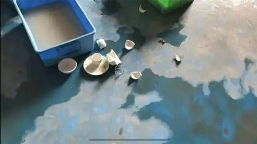 ▲人工清洗所用的水都已渾濁,地上散落著破碎的餐盤。 新京報記者 劉經宇 攝