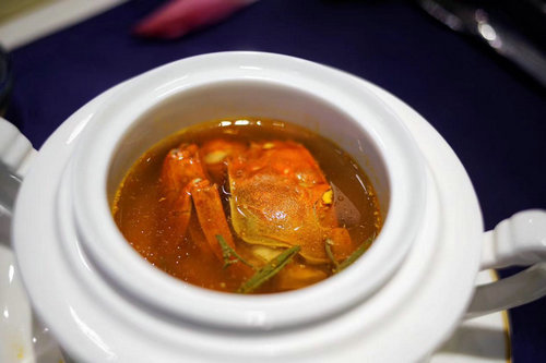 江南人講究時令的精致,對大閘蟹亦是如此。眾說“再鮮不過六月黃”,此道菜將六月黃蒸蟹浸泡于自制醬汁兒中,以老雞和龍骨燉為湯底。醉蟹釋放微醺的酒香,與被譽為“蘑菇之王”的雞油菌的杏香味相得益彰,鮮嫩又綿軟。