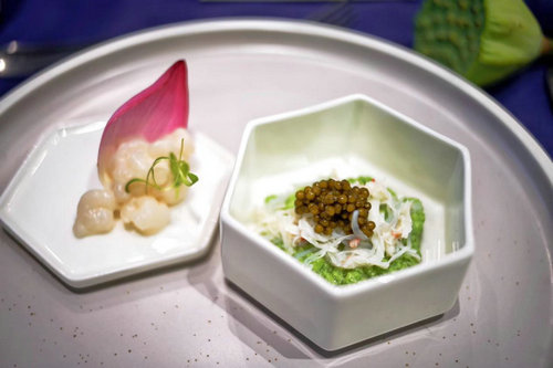 有機黃胡蘿卜,用泡姜、紅菜頭浸染的蓮藕,海藻蟶子凍、醬椒白水魚、鹽焗雞海蜇石榴包、線椒塞肉,多味搭配,清新可口,悄然拉開“荷風清飏”的幕簾,驚鴻一瞥。