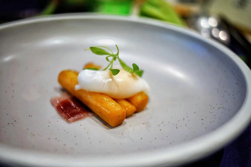 用鴿蛋烹制而成的溫泉蛋,清白如雪,黃若驕陽,吹彈可破。茭白翠綠的葉鞘下是鮮嫩的肉質,放入蝦籽加以油燜,西班牙火腿作底,馥郁咸香,卻入口輕盈,一氣呵成。