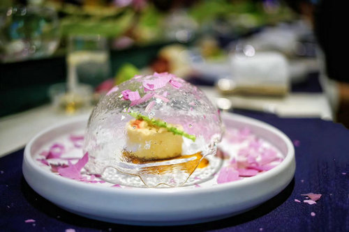 最后一道甜品黃桃冰激凌,選用當季黃桃,融合奶油,外罩透明益壽糖,以食造景。將新鮮采摘的荷花放入液氮,瞬間冷凍,拍于掌中,一片荷雨碎夢,驚艷四座。
