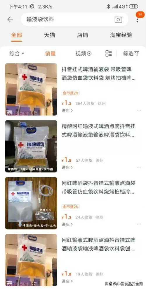 《中國食品安全網》記者用輸液袋飲料在某電商平臺上搜素,可以看到有多家店鋪售賣這種輸液袋飲料包裝,銷量也不少。