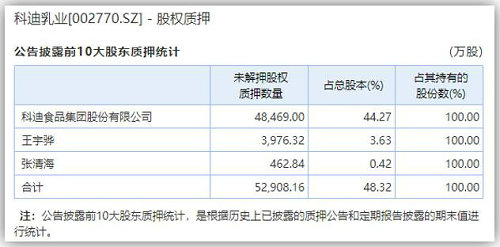 在A股整體股權質押有所好轉之際,科迪乳業的股權質押問題卻絲毫沒有緩解。以公告披露的前10大股東質押來看,科迪食品集團股份有限公司、王宇驊、張清海的股權質押竟巋然不動,仍為100%,股價較質押時已下跌50%左右…