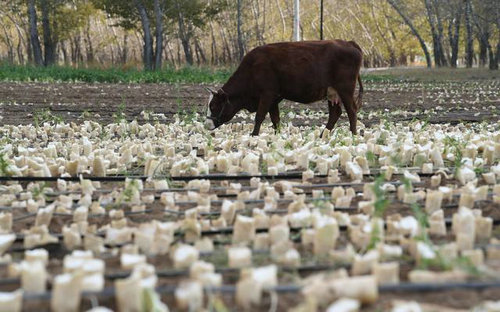 牛在被啃得一片狼藉的蘿卜地里,尋覓新的“食堂”。新京報記者 王穎 攝