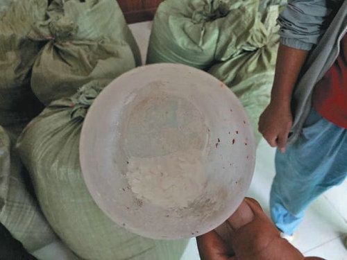 ▲8月20日,中衛沙坡頭區一加工點,老板展示泡洗枸杞的焦亞硫酸鈉,其殘留物能損傷肝腎。