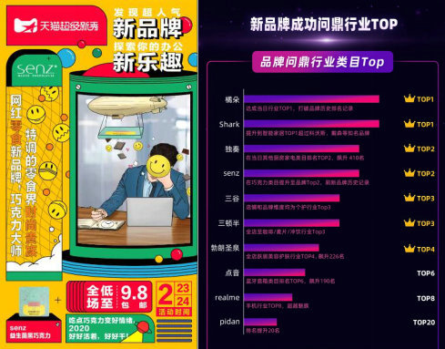 在2020年2月,senz情緒盒子的奇妙構想更是獲得了天貓的青睞,入選#天貓超級新秀#十大品牌。而作為唯一入選的零食品牌,senz心之巧克力更是表現出色,受到消費者的熱捧,在活動當天一舉奪得巧克力類目單品銷量榜第一名和品牌銷量榜第二名。