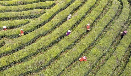 4月1日,宜都市松木坪鎮云臺觀有機茶基地,滿山青翠,茶農們斜挎竹簍,搶采“明前茶”。該基地自3月20日開園以來,每天約150人上山采茶,已生產銷售“松云”牌有機茶1500公斤,帶動周邊80多名貧困群眾就近就業。