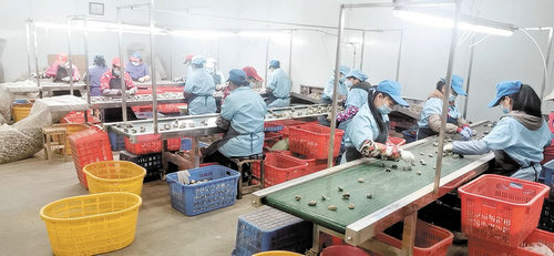 隨州市萬佳食品有限公司工人在精選香菇。 (視界網 萬闖 攝)