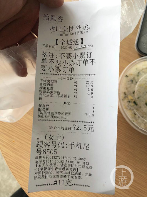 黎先生告訴記者,這份餐食表面上雖與訂單上的菜幾乎相同,但無論從質量還是分量上看,都不像自己點單的餐廳做的,“小票上每個菜的單價都與訂單不同,合計才72.5元,足足差一倍。而且小票的備注信息‘不要小票’,也實在讓人懷疑商家以低價方式替我另點一單!