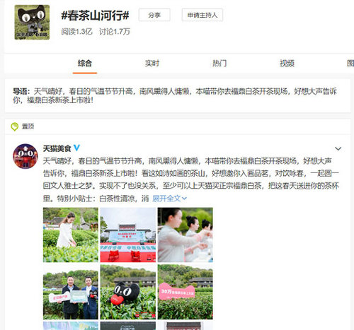 天貓還通過#春茶山河行#微博話題,在線上針對福鼎白茶上新進行了亮點傳播,話題總曝光1.3億次,廣大網友積極參與到該話題的討論互動中,福鼎白茶品牌進一步深入人心。