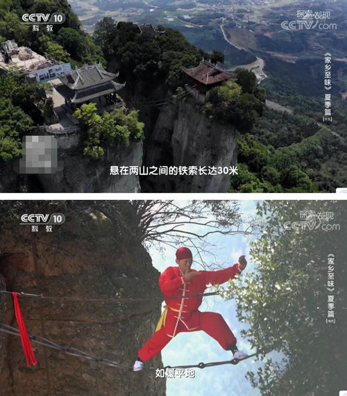 大約在 3 億年前,漫長而又復雜的沉積成巖過程和造山運動,形成了竇團山刀劈斧鑿一般的丹霞地貌。懸在兩山之間的鐵索長30米,王老爹和兒子是鐵索之上的獨步舞者。鐵索懸于深谷之上,山風勁吹,左右搖晃,驚險無比!帮w仙可渡”,能渡索橋的如今只有父子二人。他們攀行索橋,如履平地,興之所至還要在鐵索橋上表演翻跟斗、倒掛金鉤、仙人指路、金雞獨立等動作。