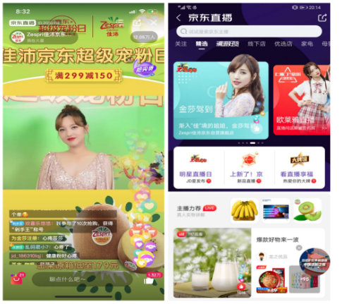 8月30日,佳沛京東超級寵粉日當天,金莎小姐姐空降佳沛直播間,引發數十萬人次圍觀!冻孙L破浪的姐姐》正在熱播,除了唱歌跳舞,莎莎子還因為“帶秤吃飯”,一度登上熱搜。 莎莎子與大家熱情分享了自己的美麗秘籍,除了自律,補充VC也會讓皮膚狀態更加年輕,佳沛奇異果就是莎莎子美麗的最強助攻。直播間內,莎莎子和佳沛粉絲一起玩轉中秋限量寵粉禮盒,并發放福利,送出千元中秋大獎 ,一同送出的還有10套朱婷周邊盲盒,直播活動異常火爆。