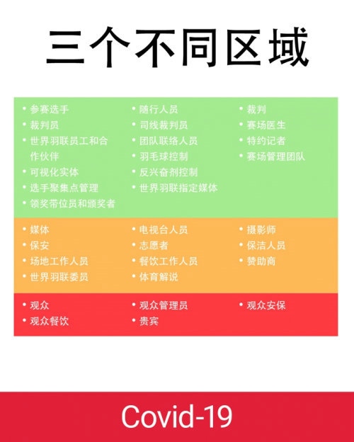 除此之外,當參賽選手、隨行人員、媒體記者、工作人員和觀眾進入到賽場后,賽事舉行場地會劃分為三個不同區域——運動員、裁判、賽場醫生、特約記者、賽場管理團隊等人員在綠色區域;媒體、志愿者、攝影師、解說等人員在黃色區域;觀眾、貴賓等人員在紅色區域。三個不同區域相互保持安全距離,本區域人員不允許進入其他區域。