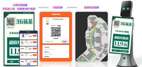 一旦消費者對優惠券感興趣后,通過機器人大屏掃碼支付即可下單,同時機器人自帶地圖又可導航到店,這些無疑可以幫“種草”的消費者“拔草”,大大提高了隨機消費者轉化為到店用戶的效率。