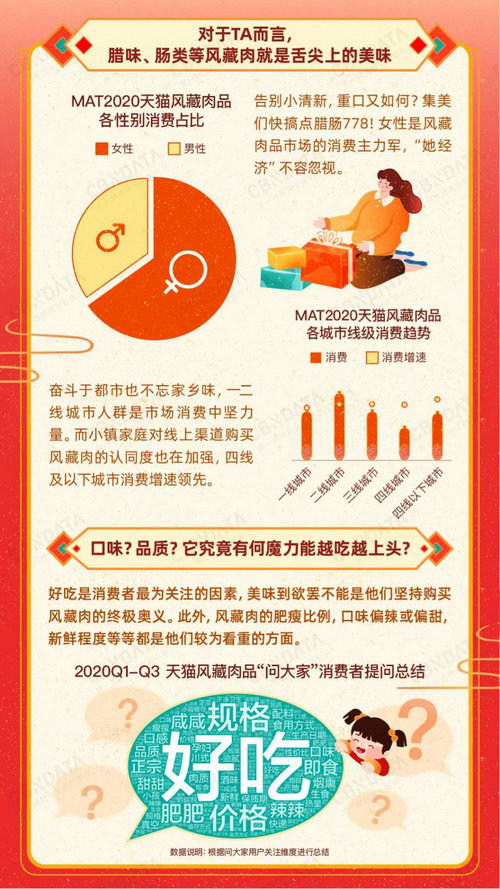 1月7日,第一財經商業數據中心(CBNData)發布《天貓風藏肉品消費趨勢報告》(以下簡稱 CBNData《報告》,點擊閱讀原文查看完整報告),基于 CBNData 消費大數據,分析風藏肉品市場的增長概況與消費者畫像,并總結出口味多元化、傳統好風味、網紅新浪潮、新生代營養、健康主旋律五大消費趨勢關鍵詞。
