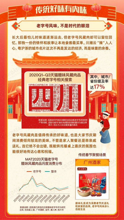 對很多人來說,吃臘味時品嘗的不只是味道,更是一種記憶。那些經典的老字號,就承載著消費者們特別的情感,也在某種程度上成為了城市的名片。CBNData《報告》數據也顯示,老字號臘味風藏肉品近年來消費呈逐年上升趨勢,2020 年消費增速大幅提升。同時各代際的消費增速也都較高,越來越多的年輕人加入到老字號的消費行列中來,如廣式" 皇上皇 "、浙江" 金字 "等老字號憑借對 " 童年的味道 " 的傳承重新煥發出品牌活力。