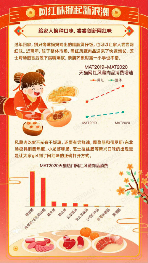 老字號自有傳統口味的魅力加持,而在社交媒體的助推下,諸多新奇口味也打動了愛嘗鮮的年輕消費者。CBNData《報告》數據顯示,天貓網紅風藏肉品的消費增速遠高于整體,爆漿腸、東北腸、糯米腸、小龍蝦味腸等產品為風藏肉品市場帶來了更多新意與趣味。