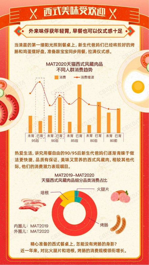 CBNData《報告》還發現,西式風藏肉品以遠超整體的消費增速,成為市場十分亮眼的版塊。90、95 后的新生代爸媽擁有較強的西式風藏肉品消費潛力?灸c無疑是其中最受歡迎的品類,且在過去一年領銜其他品類增長。