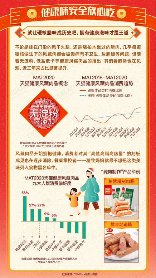 對于腌肉、臘腸等風藏肉品而言,過去我們常常需要克制自己不能多吃,因為過多的鹽分、亞硝酸鹽,給我們的健康帶來許多負擔。而隨著消費者健康意識的強化,無淀粉、無添加劑、低脂、少鹽的臘味逐漸發展起來,CBNData《報告》顯示,健康風藏肉品的消費占比在近三年來顯著提升。精致媽媽、新銳白領和 Z 世代對于健康的風藏肉品有更強烈的消費偏好。