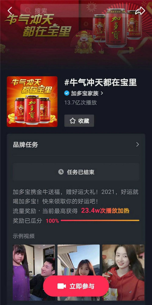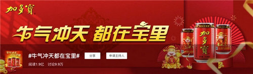 針對今年就地過年的特情,加多寶憑借創新的數字化營銷手段,推出“牛氣沖天都在寶里”抖音挑戰賽活動,解鎖跨界年味營銷新方式,以創意十足的祝福形式,吸引一大波短視頻年輕用戶流量,進行圈層營銷建設的同時,向更多人分享快樂和好運。據悉,本次挑戰賽微博話題閱讀量突破1.9億,抖音話題播放量超13.7億次,為大家帶來了“牛年開門紅”。