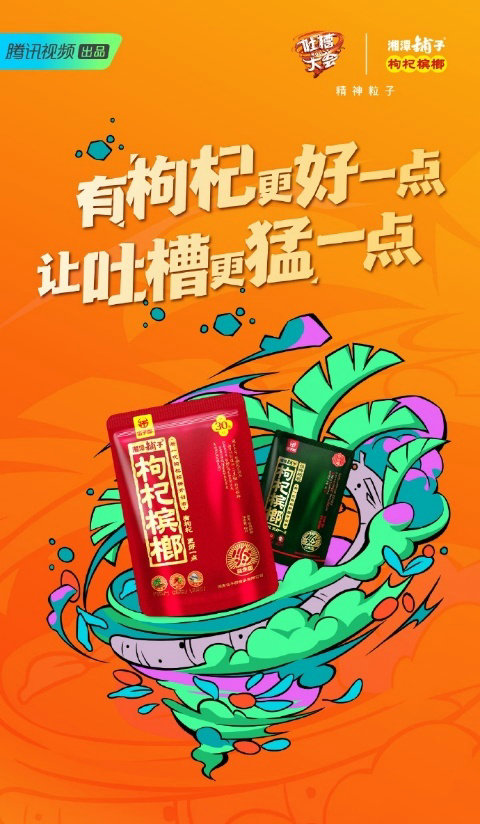 不管是此次和《吐槽大會5》的攜手,還是早前和大熱綜藝《德云斗笑社》的合作,都是對湘潭鋪子精準的綜藝眼光的有力佐證!湘潭鋪子的枸杞檳榔原材料考究,甄選海南五指山新鮮檳榔,寧夏中寧特級枸杞,有豐富的食用價值。枸杞檳榔,不僅是吐槽大會聯盟者的精神粒子,也是眾多吐槽愛好者和觀看者的消遣零食。