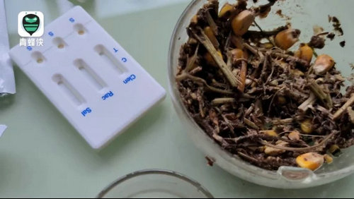 經記者取樣,尼龍袋里的灰白色粉末為“瘦肉精”,添加灰白色粉末的飼料中同樣檢出“瘦肉精”。