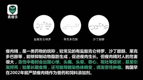 “瘦肉精”是指能夠促進瘦肉生長的一類物質,主要包括:鹽酸克侖特羅、萊克多胺、沙丁胺醇等腎上腺素受體激動劑,豬、牛、羊等攝入“瘦肉精”后能加速生長、提高瘦肉率、降低脂肪沉積、提高飼料報酬等,使用“瘦肉精”后會在動物組織內形成殘留,消費者食用后直接危害人體健康。我國在2002年就已經嚴禁瘦肉精作為獸藥和飼料添加劑。