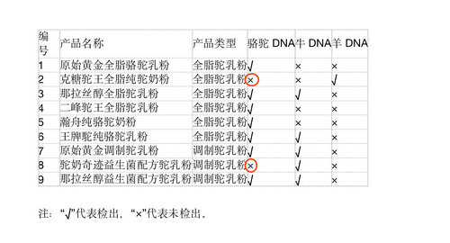 檢測結果顯示:6款純駝乳粉中,有3款檢測出除駱駝外的動物DNA。另有2款駝乳粉未測出駱駝DNA,意味著不含駝奶成分。