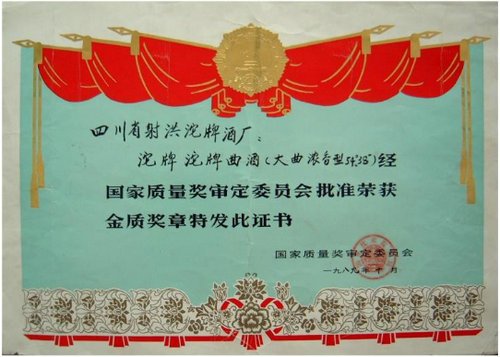▲沱牌所獲1989年國家名酒金質獎獎狀