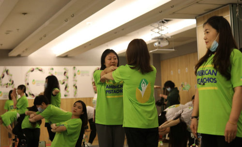 隨后,加州小姐Eileen Kim云上中國行正式開啟,最先登陸的是北京的瑜伽現場。隨著瑜伽老師的口令,媒體們專注于自身呼吸下的一個個體式動作,彰顯身體的協調、拉伸和力量水平,而最后團隊合力一起拼成的PISTACHIO(開心果)造型,更是給大家帶來了不小的驚喜。北京現場的營養師也向所有觀眾科普了美國開心果與運動相關的營養益處。對于選擇健身來瘦身的人群,美國開心果可謂是一個營養的發電站,為運動愛好者提供優質的完全蛋白來源。另外,在運動中因為出汗而流失的鉀,也可以通過吃開心果得到補充,因為一盎司開心果中的鉀含量相當于半個大香蕉的鉀的含量,在運動后食用,有助于及時補充重要的礦物質以及微量元素。更令人驚喜的是,開心果所含的葉黃素、β-胡蘿卜素和γ-生育酚等天然抗氧化劑,將極大促進肌肉恢復,成為訓練過程中的“秘密武器”。Eileen也表示,她喜歡早起,這樣既可以享受加州的日出,也可以用慢跑或者瑜伽等運動開啟活力的一天,而美國開心果也是她喜愛的營養零食,可以隨時隨地補充完全蛋白。