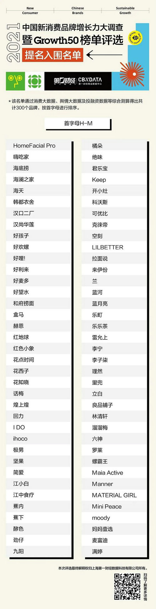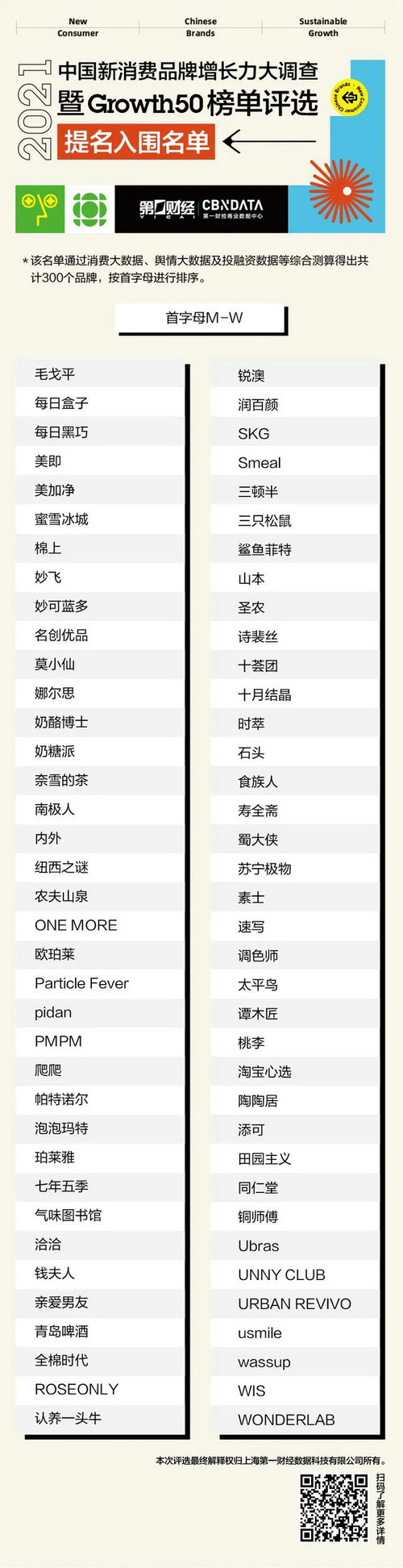 通過消費大數據、輿情大數據及投融資數據等綜合測算,提名入圍“2021中國新消費品牌增長力大調查Growth50榜單評選”的300個品牌正式出爐,現作以下公布。