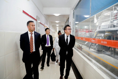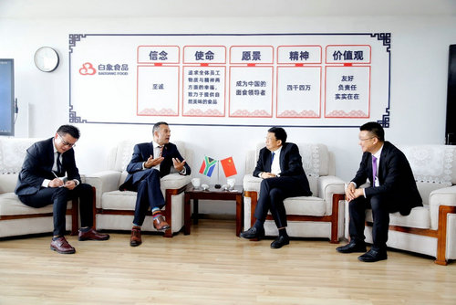 南非駐華大使館公使銜參贊約瑟夫先生的此次來訪受到全體白象人的熱情接待。訪問期間,約瑟夫先生在白象食品國際貿易團隊的陪同下,參觀了白象食品總部生產工廠、白象食品歷史展廳和白象食品分子公司辦公室等。約瑟夫先生首先走訪了位于鄭州新鄭的白象食品工廠,充分了解白象食品的制造工藝和匠心品質。在方便面加工車間,流水線的強大生產力和井然有序的員工生產場景讓他稱贊不已;在白象慢曬掛面晾曬車間,白象團隊傳承古法制面曬面的匠心和聚焦原料、工藝和標準等強大的科研能力讓約瑟夫先生發出連連贊嘆;在參觀了白象食品歷史和產品展廳后,約瑟夫先生對白象食品豐富的產品品類和創新研發實力連連豎起了大拇指。在整個實地參觀期間,白象食品向約瑟夫先生展現了作為一家中國地道民族企業的實力和自豪,約瑟夫先生不止一次地對白象食品工廠的技術水平表達由衷贊賞,稱贊白象食品作為中國著名的民族品牌,可以在南非市場起到標桿級的示范作用。