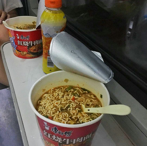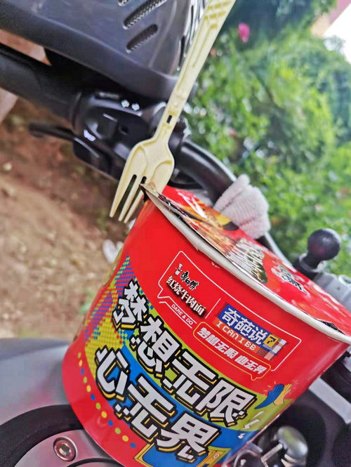 路上飯點,周瑜明有時候會拿準備好的小型酒精爐煮一壺熱水,然后泡一桶康師傅紅燒牛肉面。紅燒牛肉面是各種口味泡面里最被人所熟知的泡面,這也恰恰是周瑜明選擇這個口味的理由。