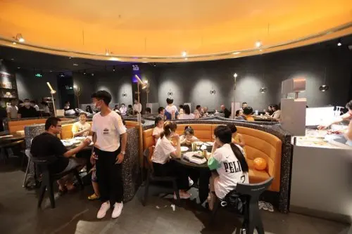 首先最直觀的改變就是店面環境的升級,從感觀上給予了LAB店更加“實驗性”的外觀風格。黑灰搭配了部分的橙色色調,似乎代表了前期所表達的烤魚延續一萬年的火種和神秘原始氣息。在整體結構上增加線條分明的金屬感呈現出未來科技氛圍,映襯此次概念店的“LAB”實驗風格。進店后可以明顯感知到的是,這家LAB店從空間的應用上更能從顧客視角出發,設置了更多具有私密感的環繞式卡座,增加了隱藏在桌下的置物籠箱,卡座位置上的設計與自助的茶水臺與冰粉臺距離分配均勻。整體從店面設計開始,已經在提升顧客就餐時的舒適性與便利性。