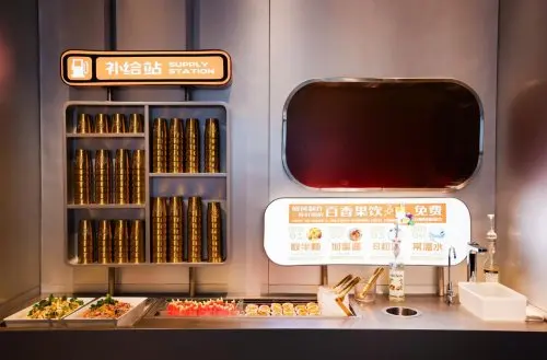 體驗經濟概念在這家探魚LAB店最明顯的反映就是增加了“自助區”。其實餐廳里設置自助區并不是什么新興的概念,但從最近小紅書、抖音等分享平臺內容來看,這家探魚LAB店讓顧客“在自助區玩嗨了”。