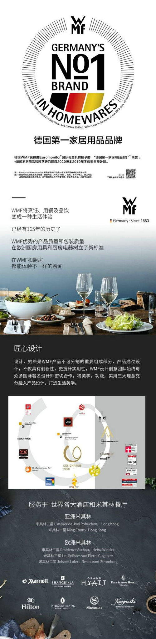 自1853年以來,WMF就致力于將烹飪、用餐及品飲變成一種快樂的生活體驗。WMF的產品涵蓋家庭與社會餐飲領域,并享譽全球。每當顧客使用WMF產品,我們都能為他帶去全新的體驗。身為行業的領導者,不斷創新產品與服務,提供引領潮流的設計和一流品質的產品,呈現品牌活力和熱忱,都是WMF義不容辭的責任。