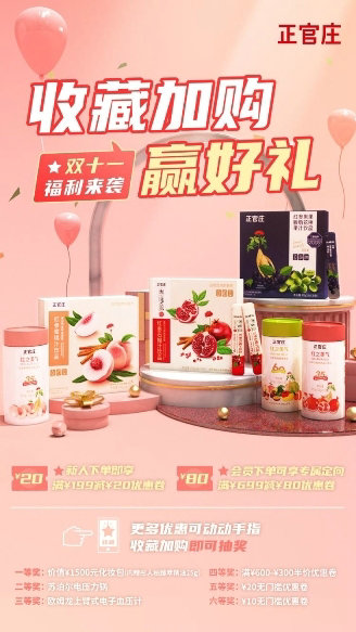 除此以外,正官莊旗下還有高麗參茶、高麗參膏、模壓紅參等產品陸續登陸了雙十一的優惠陣容。在第二波雙十一活動中,正官莊還放出了巨額福利助陣:百元貓超卡、歐樂B牙刷、彤人秘保濕緊致精華露等豪華大禮。對于一路支持正官莊的各新老會員們,正官莊也準備了相應的福利回饋。新會員下單可享立減優惠,老會員們可享受專屬的大額滿減優惠券,下單還可參與福利抽獎!