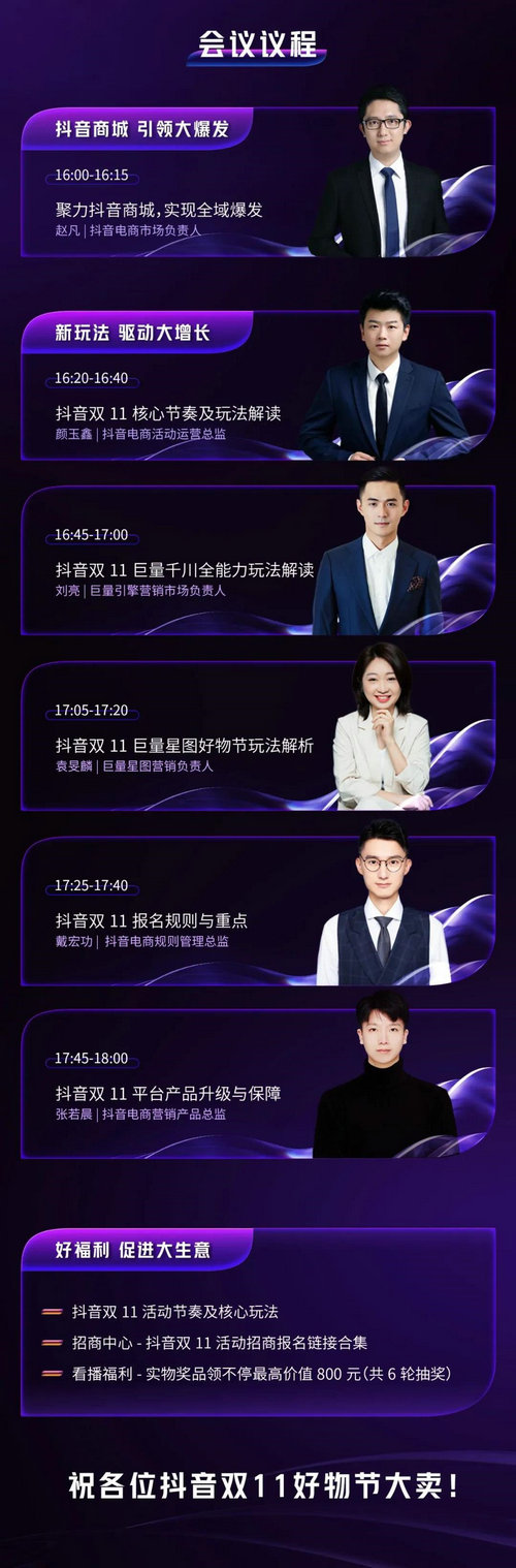 9月27日的抖音雙11招商大會,將從營商環境與抖音電商發展態勢解讀、大促信息分享、平臺治理三個層面展開。一方面,對抖音雙11活動玩法、扶持規則等進行介紹;另一方面,抖音電商也旨在帶來對當下營商環境、消費趨勢的洞察,帶領廣大商家、達人抓住機遇,進入狀態。