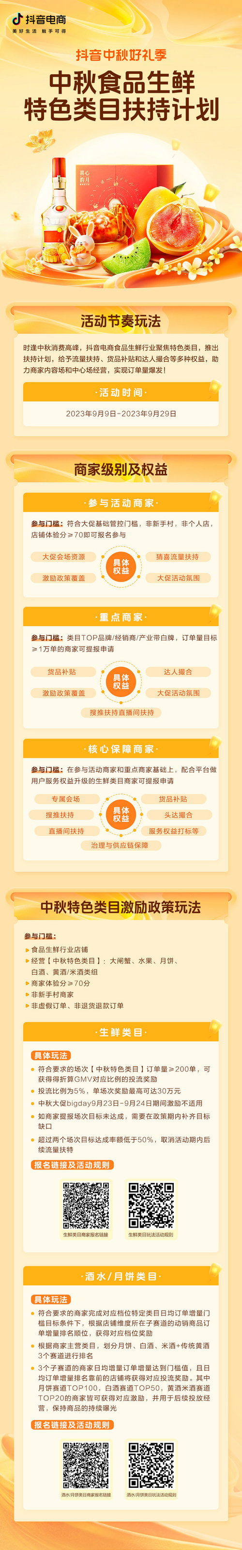 「抖音中秋好禮季」將延續「金秋收獲季」對食品生鮮重點品類的專項扶持政策,在貨架場、內容場等方面推出專屬權益,助力商家達成品效增長。