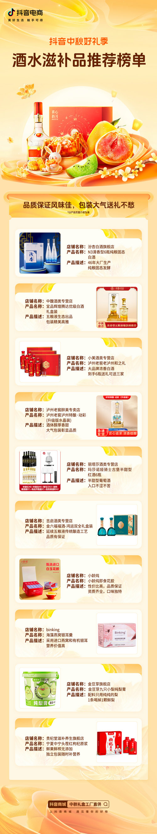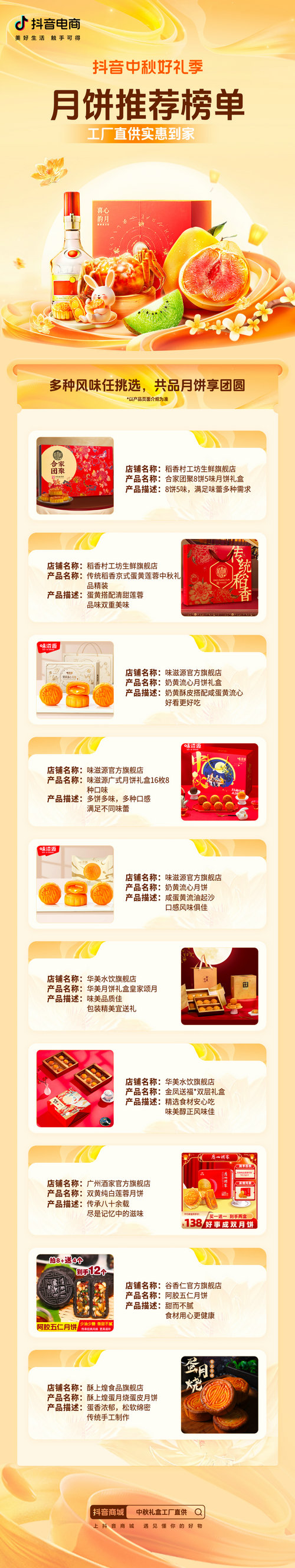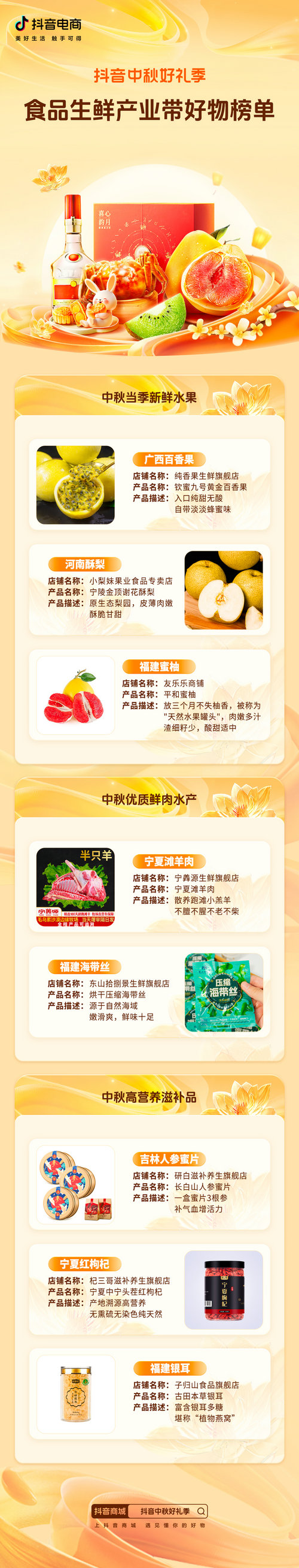 上抖音電商,品中秋美味!「抖音中秋好禮季」食品生鮮好物榜單,將助推更多食品生鮮好物成為中秋爆品,并將由點及面,激發上榜商家全店生意增長。目前,食品生鮮品類扶持計劃仍在火熱進行中,符合資質的生鮮/月餅/酒水商家,關注公眾號“抖音電商營銷觀察”報名參與,抓住大促機遇,借勢平臺資源,實現生意躍遷。