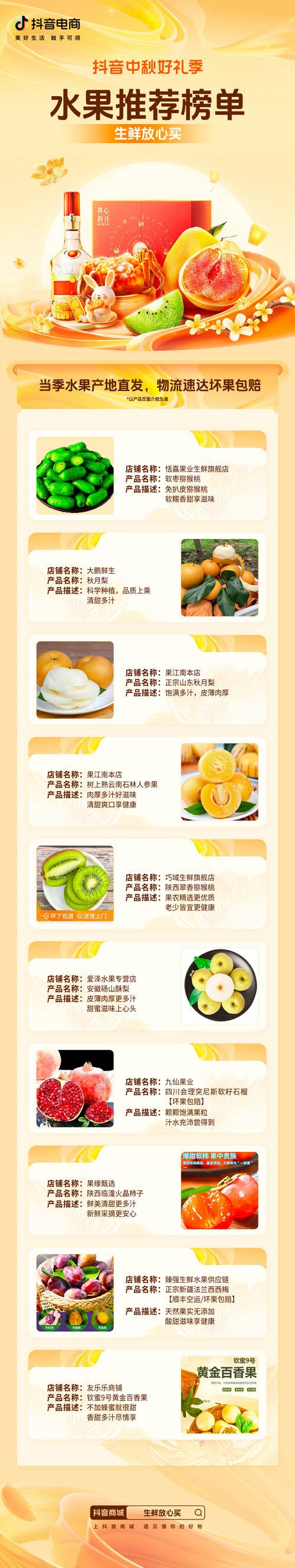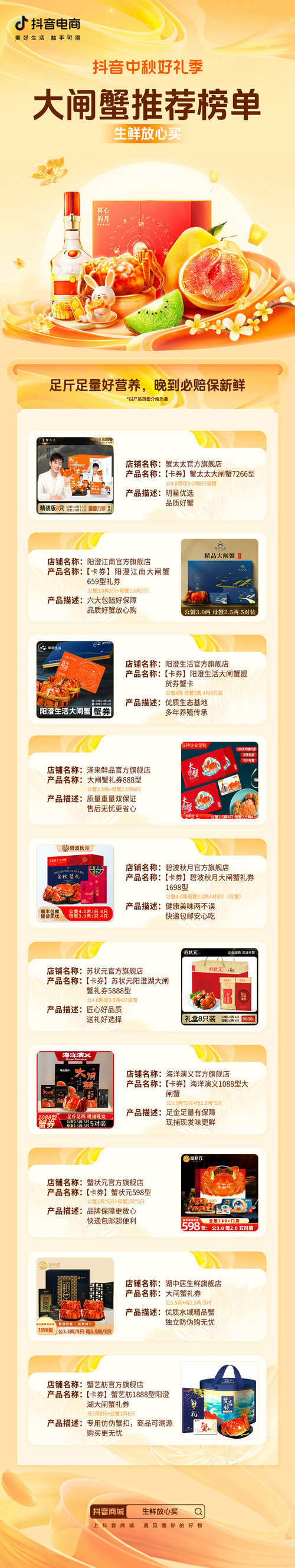 在流量扶持方面,開放抖音商城、搜索、超值購頻道、低價秒殺頻道等貨架渠道,為特色類目商家提供搜索流量、搜索品類優惠券等冷啟動加熱扶持,并在商城首頁資源位、直播精選等黃金位置給予大量曝光。達人帶貨方面,推出溯源直播間、大閘蟹/月餅專場玩法;在商家自播側,則搭配了好物直播間、中小商家開播激勵賽等玩法,并給予達播和商家自播直播間官方流量扶持,讓更多美食好物被看到,并能及時轉為銷量。物流售后方面,抖音電商聯合商家、物流公司、保險公司等多方主體,針對大閘蟹、水果等時效要求較強的品類,推出精細化售后服務,包括承諾日達、晚到必賠、壞了包退等貼心權益。