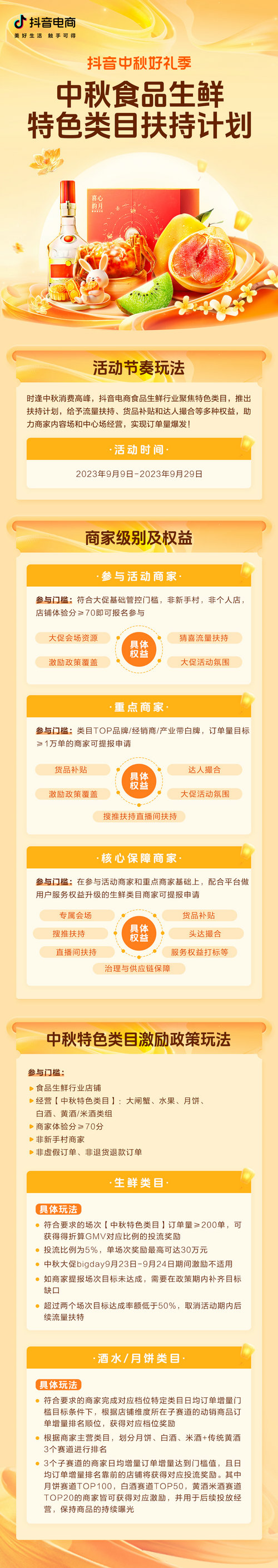 針對大閘蟹、水果、酒水、月餅四大中秋特色類目,抖音電商也給出了更精細的激勵政策。大閘蟹、水果等生鮮類目商家參與活動,單場次獎勵最高可達30萬。酒水和月餅商家日均增量訂單增量達到門檻值,且日均訂單增量排名靠前的店鋪也將獲得對應投流獎勵。