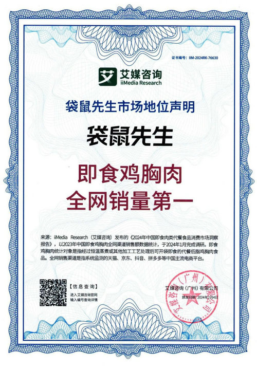 2024年2月,袋鼠先生獲全球新經濟產業第三方數據挖掘和分析機構iiMedia Research(艾媒咨詢)授予的“即食牛肉全網銷量第一”和“即食雞胸肉全網銷量第一”雙項市場地位聲明認證。