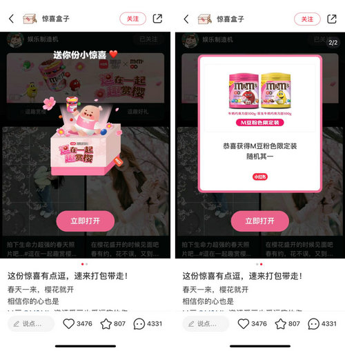活動期間「驚喜盒子」限時掉落,也充分調動起小紅薯們的參與熱情。搜索【逗在一起趣賞櫻】或【M豆逗在一起趣賞櫻】并瀏覽相關筆記,即有機會獲得@M&M's送出的春日驚喜。福利機制在高效拉升品牌搜索數據的同時,進一步引爆活動氛圍。