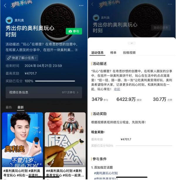 奧利奧精心設計了多條通達至轉化鏈路的引流路徑;谝曨l號達人生態鋪開的品牌內容,讓觀眾可以通過視頻內容附帶的小程序鏈接快速跳轉至品牌的小程序和活動頁面;除此以外,在朋友圈廣告等資源版位進行的內容推廣,也能再次準確的覆蓋目標用戶群體,實現有效的引流。