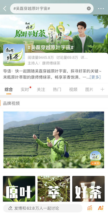 線上,康師傅綠茶在微博、抖音、小紅書等社交媒體全面釋放,同步在愛奇藝、優酷等頭部視頻平臺強勢曝光,不斷占領“原葉萃好茶”的消費者心智,最大化地聚集了傳播流量,#吳磊穿越原葉宇宙#話題更是沖上微博熱搜,截至目前,話題閱讀量已高達9400W,實力占據熱度制高點。