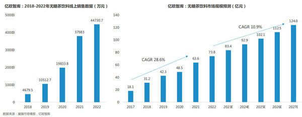 而在即飲茶這個第一賽道上,無糖即飲茶的份額呈現明顯的上升趨勢。億歐智庫發布的《2023中國無糖茶飲行業白皮書》顯示,我國無糖茶飲料從2018到2022年線上銷售規模突破10倍,預計到2025年市場規模將突破百億大關,到2027年將達到124億元。
