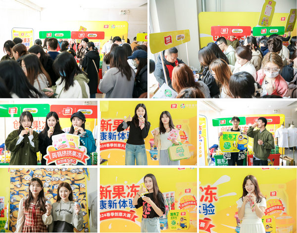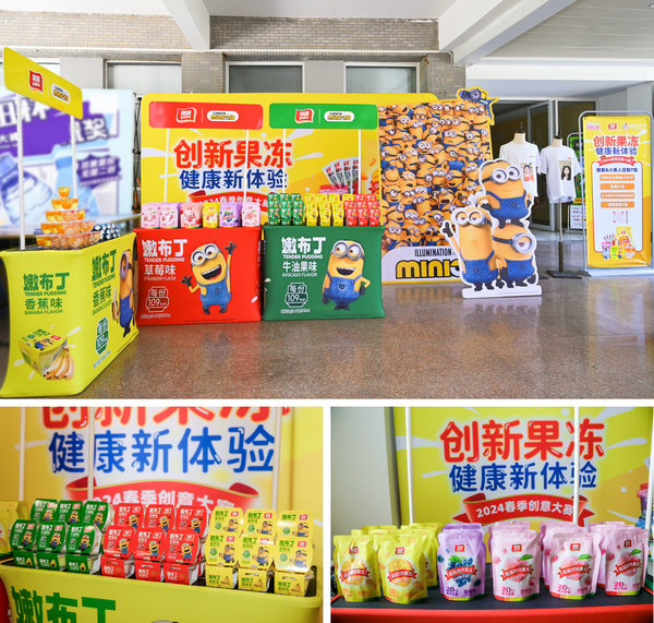 多款創新果凍系列產品“輪番上陣”,瘋狂圈粉大學校園里的“果凍腦袋”,共同解鎖“健康輕負擔”、簡單而美好的味蕾享受。更有小黃人聯名果凍以及專屬打卡區高燃登場,成為眾多學子的青春焦點。同學們手握美味、熱情點贊,便是最鮮活的種草認證!