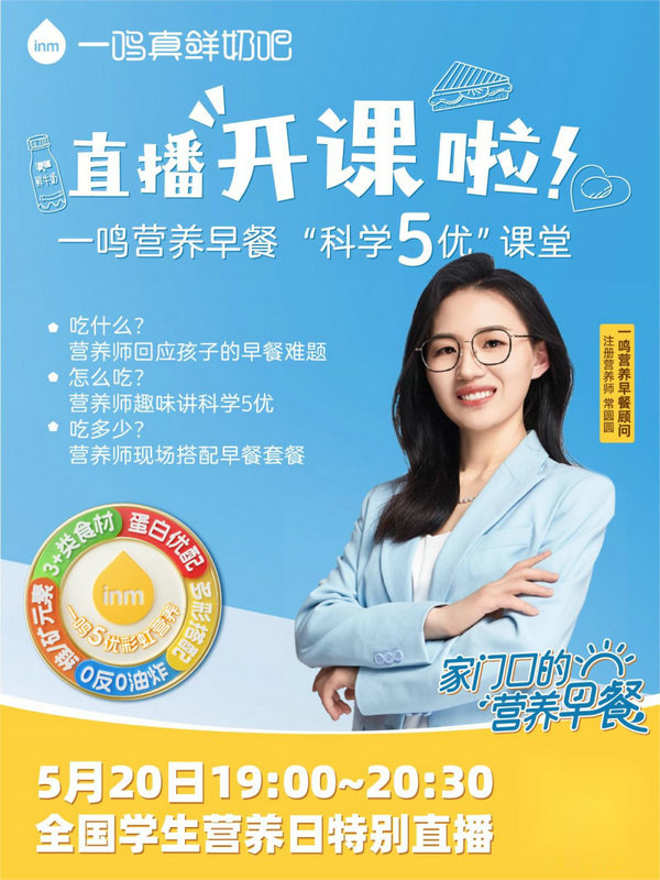 除此之外,為了一次性幫助解決全家人的營養早餐難題,一鳴真鮮奶吧特邀營養領域的權威專家——注冊營養師常圓圓,于5月20日開啟一場 “科學5優營養課堂”直播,在線為消費者圈重點。這次直播活動將深入探討困擾很多媽媽的早餐難題,深度剖析熱門的兒童營養問題,以及講解如何通過食材選擇和搭配實現“科學5優”。專業營養師還將分享她豐富的專業知識和青少年營養學經驗,針對黃金成長期的孩子,為各位媽媽提供實用的營養建議和早餐方案。