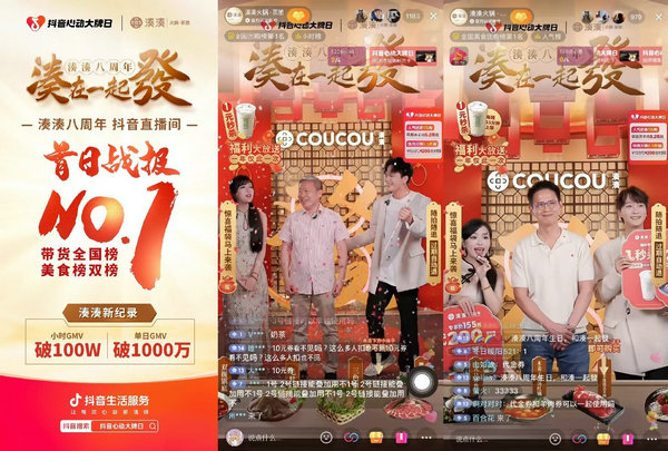 場景煥新了,那八周年慶的玩法自然也要來點新意!5月18日當天,「抖音心動大牌日」還聯合湊湊火鍋開啟了「去拼8湊」雙會場8周年全域發布會直播,不僅贈券加倍,而且福利升級,更有創始人空降直播間為用戶送出超多福利。